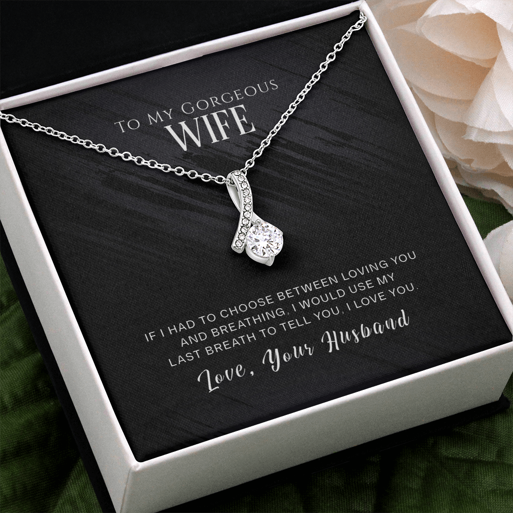 Melt her heart with this ALLURING BEAUTY necklace gift! The petite ribbon shaped pendant is finished with 14K white gold over stainless steel, and is embellished with dainty clear crystals surrounded by a sparkling 7mm round cut Cubic Zirconia.