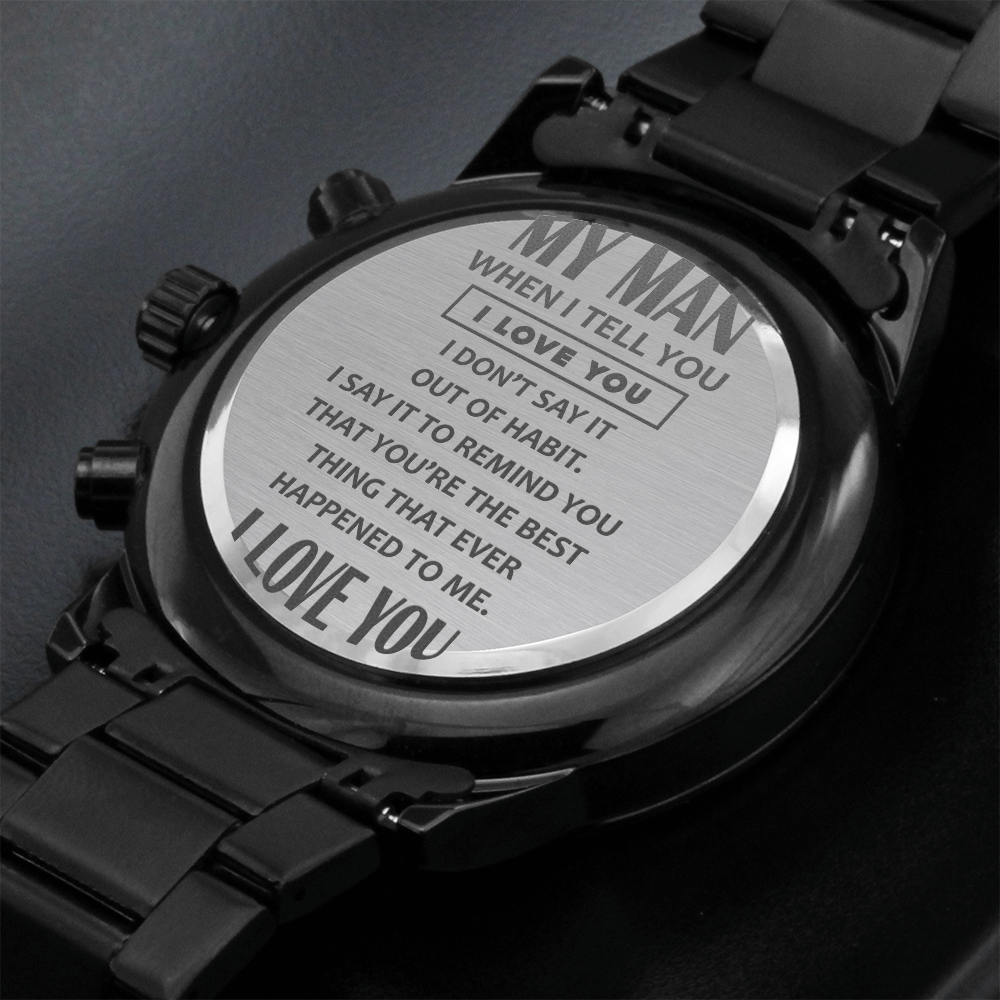 A personalized gift that can withstand constant use, this Engraved Design Black Chronograph Watch is the perfect gift for all the special men in your life. A thoughtful groomsmen gift, an anniversary memento, or a long-lasting keepsake for Father’s Day - it's a versatile piece sure to warm hearts and create smiles. Featuring a three-dial face, calendar function, and luxury pointer in a water-resistant and scratch-proof vessel.