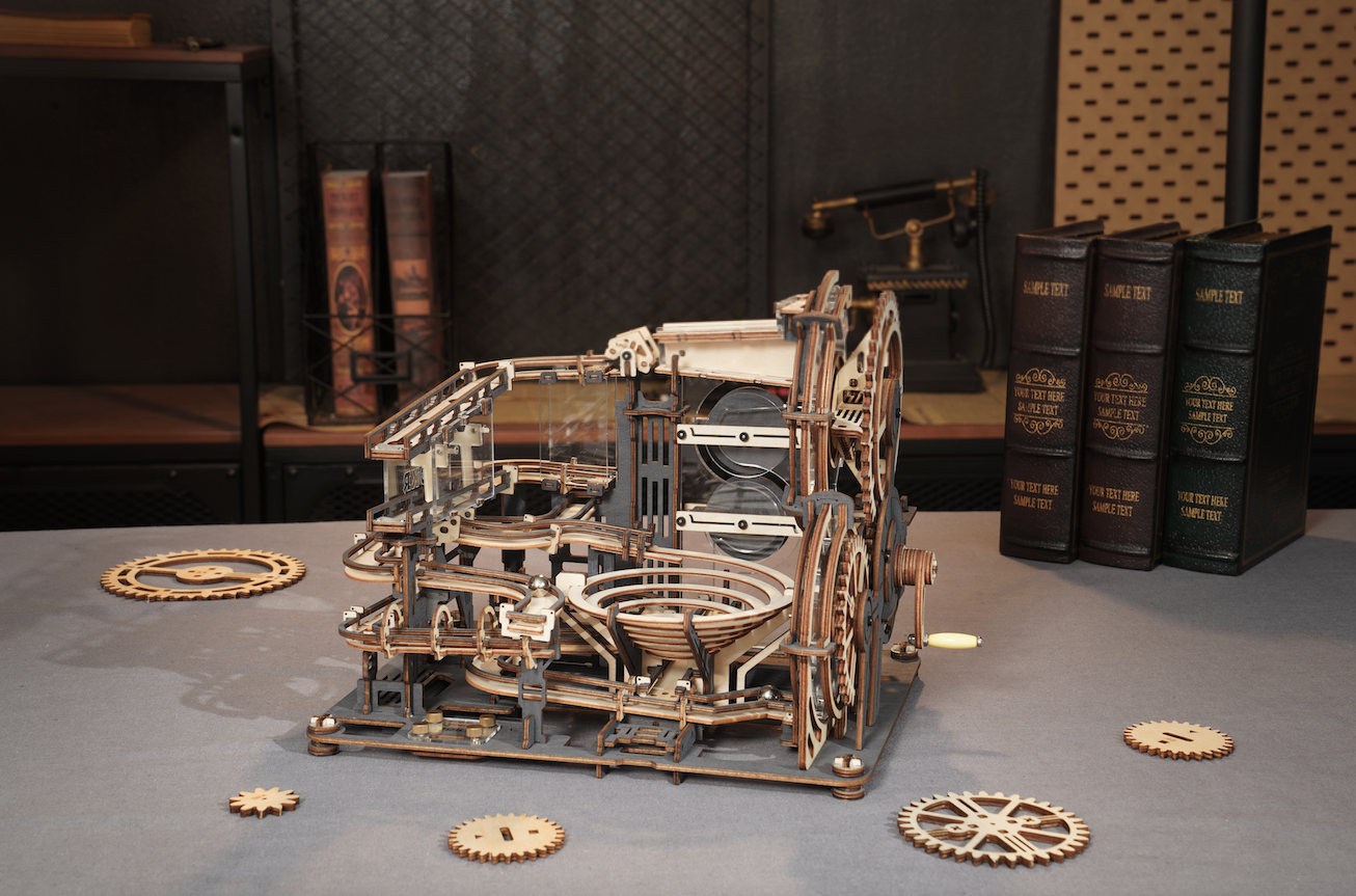 - [INTERLOCKING DESIGN] Working in tandem through gears and organs. Turning the hand-crank, the steel marbles will travel along the track from two routes circularly. A vivid case of learning mechanics.