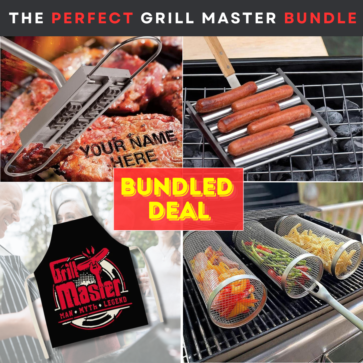 Grill Master Exclusive Bundle - 2x Large Rotisserie Grill Baskets + HotDog Roller + Grill Master Branding Iron + Custom Grill Master Apron