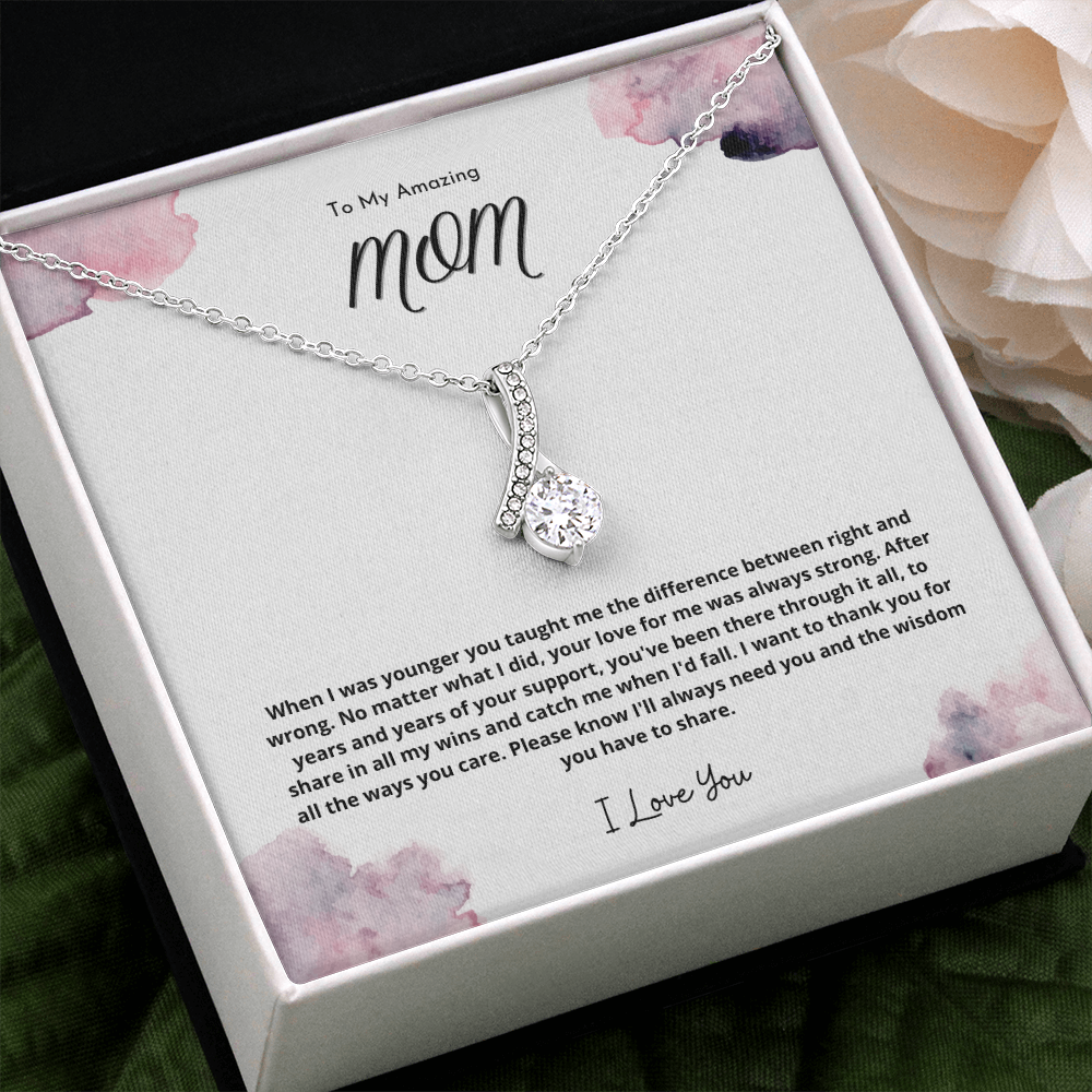 Melt her heart with this ALLURING BEAUTY necklace gift! The petite ribbon shaped pendant is finished with 14K white gold over stainless steel, and is embellished with dainty clear crystals surrounded by a sparkling 7mm round cut Cubic Zirconia.